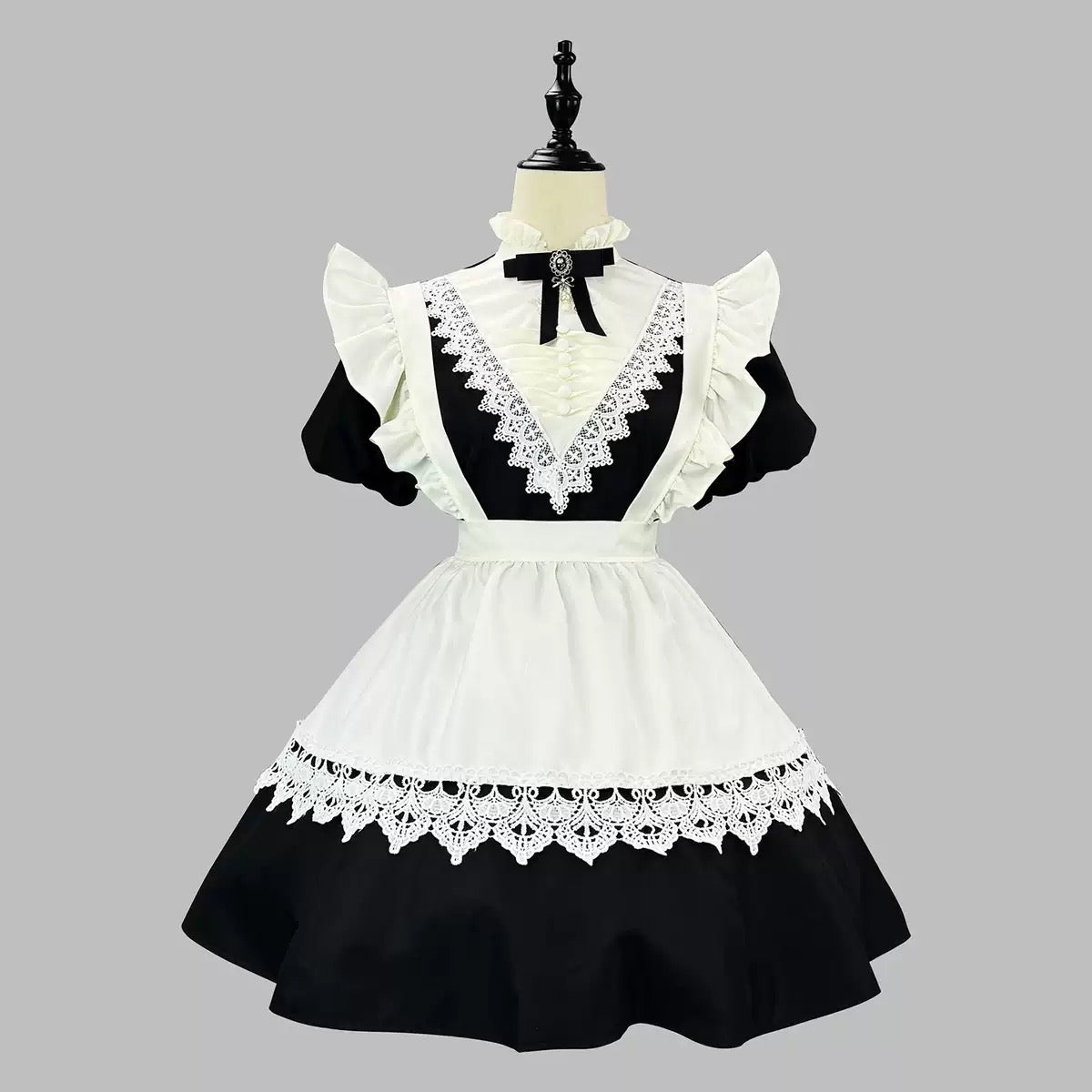 Indulge in the charming allure of our Coffee Maid Dress, a perfect blend of classic style and playful sophistication. This dress features a rich coffee-colored bodice with contrasting white apron and ruffles, trimmed with delicate lace for a refined touch. The full skirt with apron ties at the back creates an iconic silhouette, while the cap sleeves and matching headpiece complete the enchanting look. Ideal for cosplay events or as a unique addition to any costume collection.