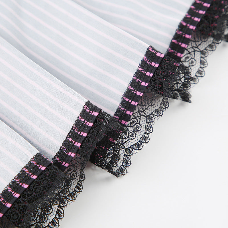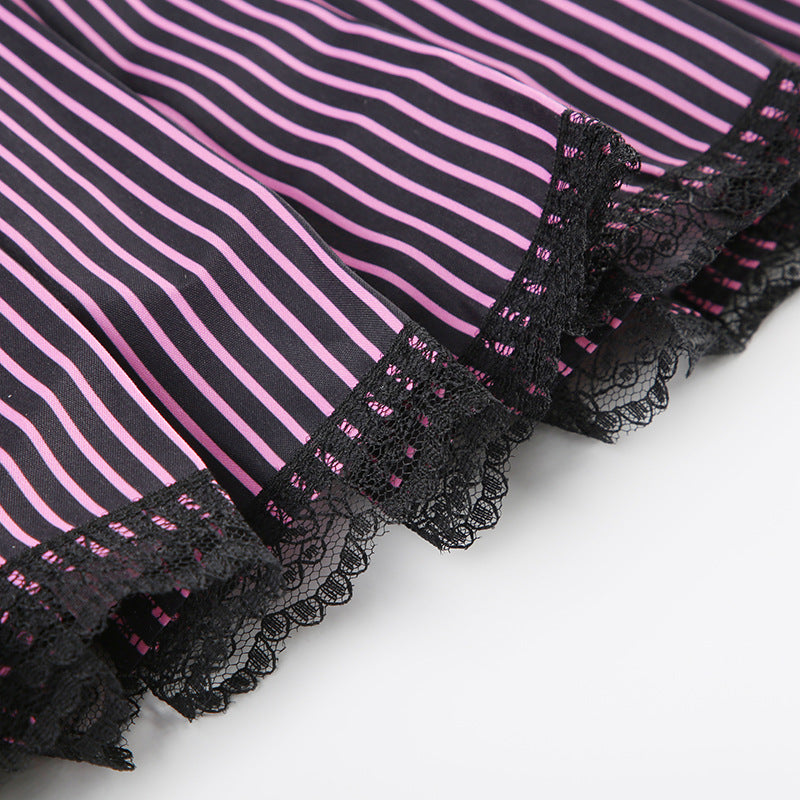 Black and pink stripe pleated skirt for the girly boys. Made with high polyester and spandex, it is lightweight, soft, and comfortable. The high waist design can pair with most tops, such as t-shirts, corset tops, crop tops, camisoles, etc. The red and black striped pattern is very retro and suitable for any girl with a personality. The embellishments of lace and bows make this skirt sweet and cute. Very suitable for date, beach, casual daily, shopping, Valentine's Day, etc.